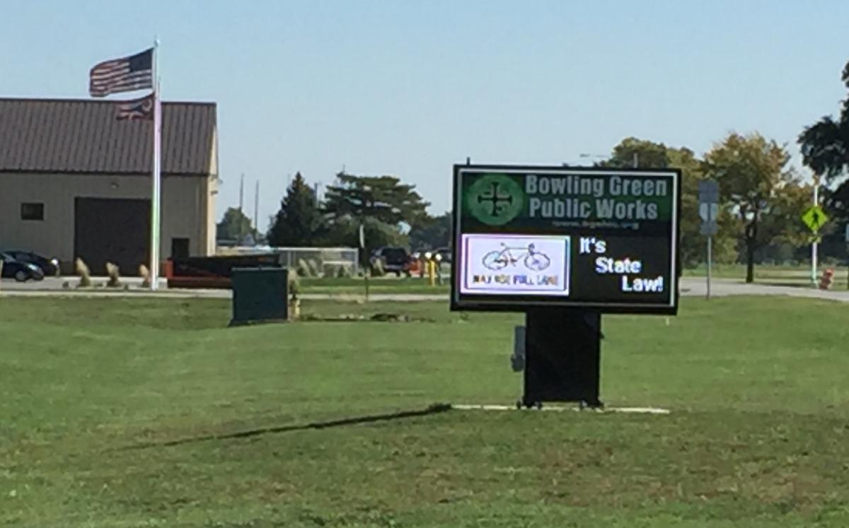 It was very exciting to see "Bicycles May Use Full Lane...It's State Law" on the electronic sign in front of the Bowling Green Public Works building. Educating the public about the cyclists rights and responsibilities is a team effort in Bowling Green. The City's engineer, Jason Sisco, has been instrumental in aiding the staff in learning about bicycle related issues, including Complete Streets. Please help us in thanking Brian Craft (Public Works Director), Bowling Green Police Department, Fire Chief Tom Sanderson, and especially Jason Sisco for getting the word out!