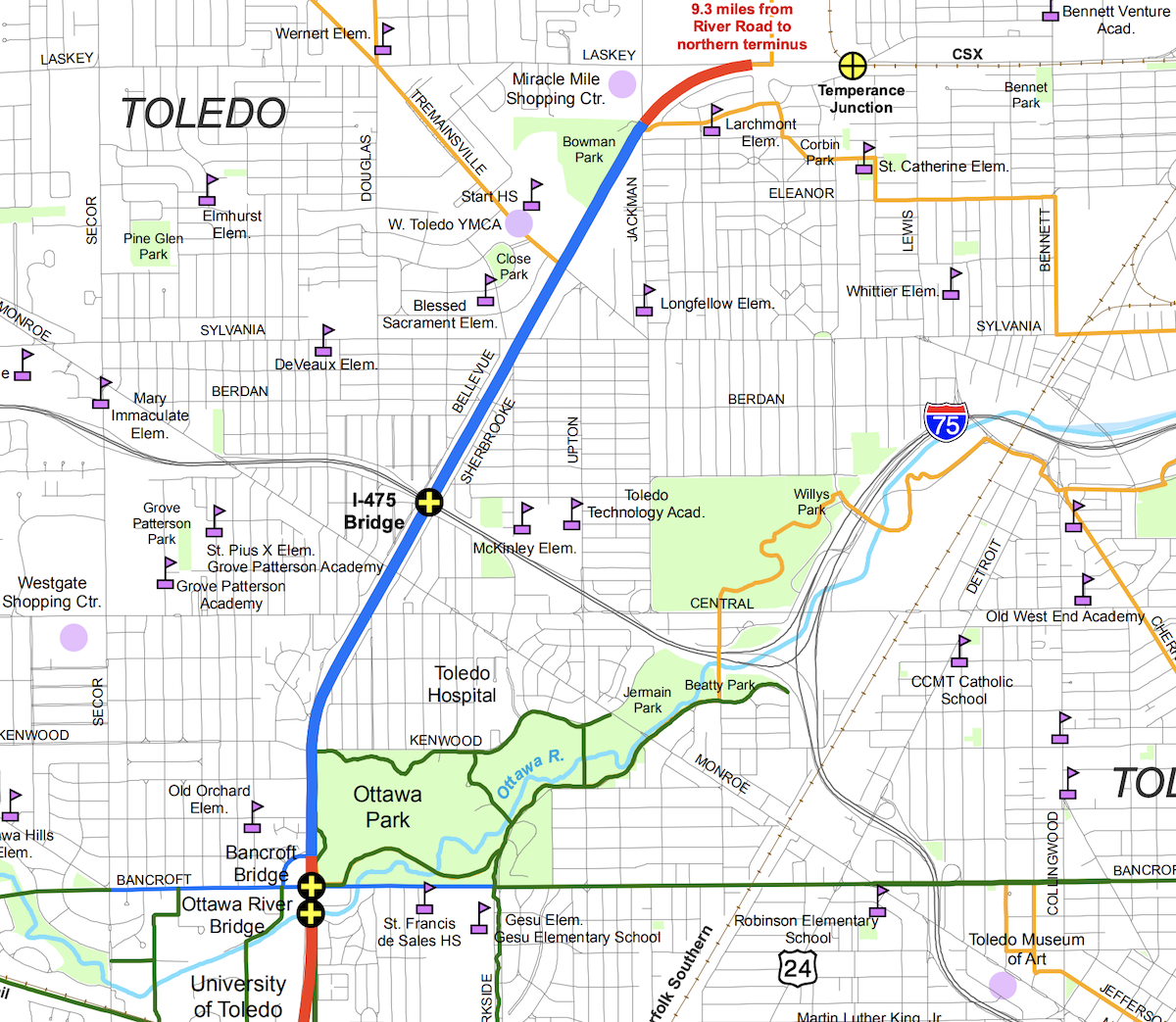 This is a resurfacing project coordinated between Sylvania Township, Lucas County and City of Toledo for 2021 construction. We Are Traffic requested a review of this project for possible bike lanes and with the help of LCOE, all jurisdictions agreed to add marking for bike lanes. As with the other two projects, we will need to seek funding to add bike lane signage and lane markings. While the bridge over 475 creates a bottleneck, we'll have bike lanes on the south side to Central Avenue.